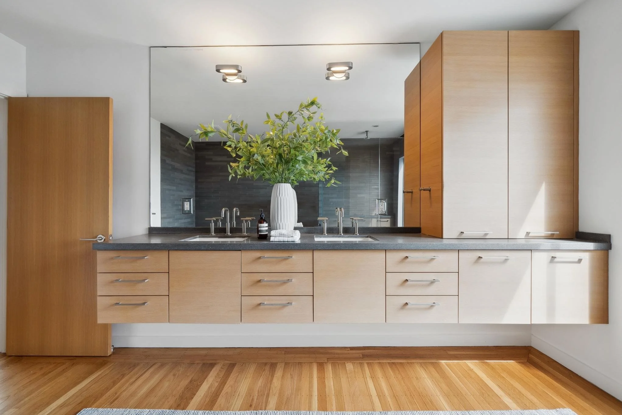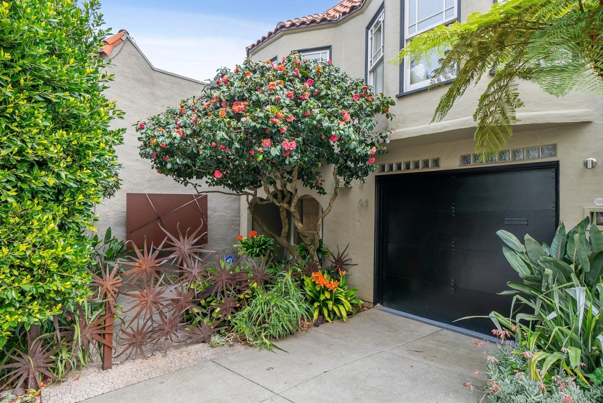 Extensively renovated in 2008, the home’s entry features a striking custom front gate and fence by Jefferson Mak and a Shona serpentine stone sculpture with a reflecting pond. The home boasts beautiful hardwood floors complemented by the comfort of radiant in-floor heating and efficient forced air heat. Designed with sustainability in mind, it also includes solar panels and an EV charging outlet.