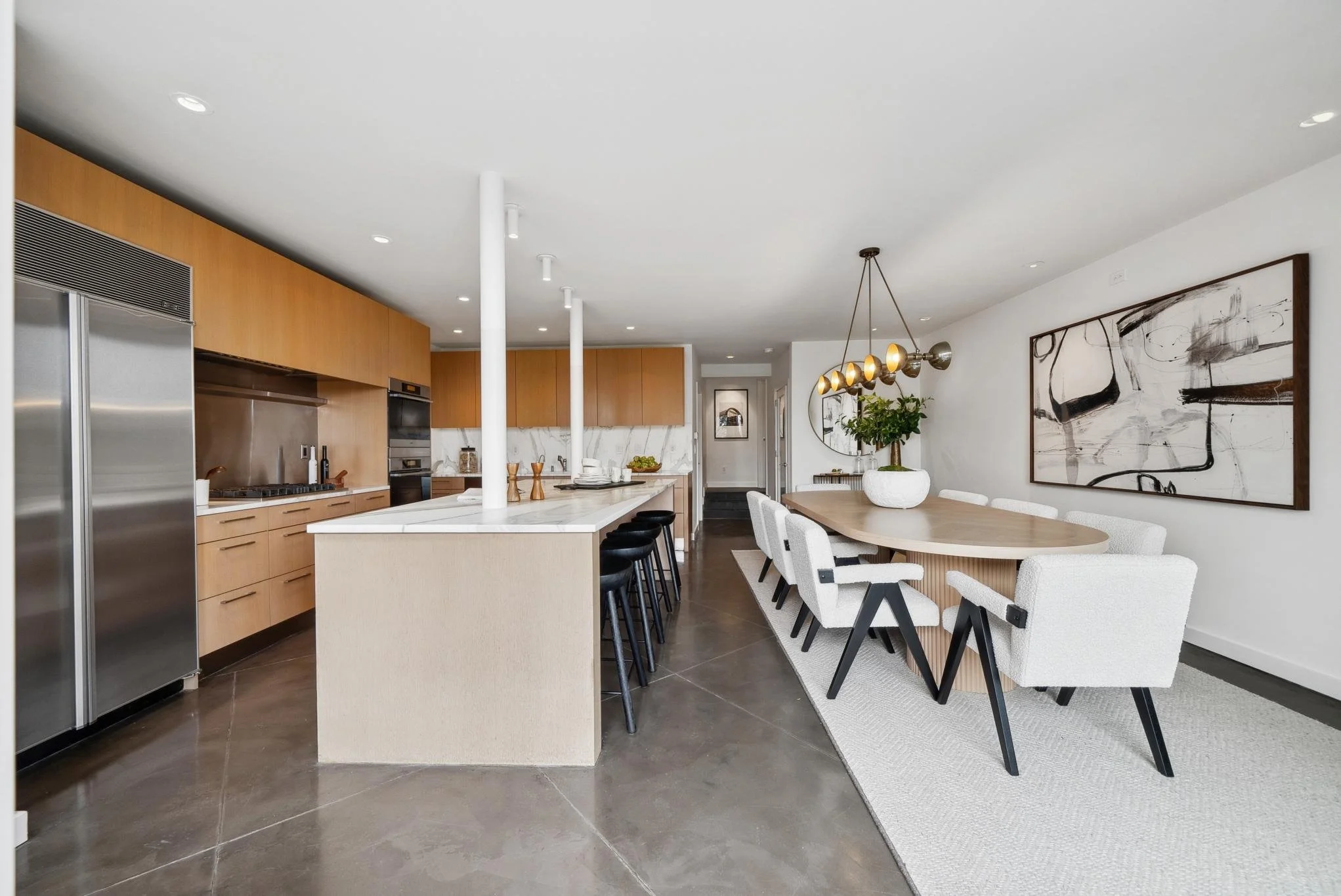 The chef’s kitchen is equipped with a SubZero refrigerator, Bosch dishwasher, and two Miele ovens, along with marble countertops, a large center island, custom cabinetry by Korts & Knight, and two pantries.